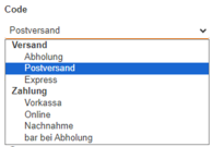- Code: Das Feld "Code" ist ein Dropdown-Menü, organisiert in zwei Gruppen: Versand und Zahlung. Wählen Sie eine Option, die zur Art der Option passt, um sicherzustellen, dass die Kombinationen von Versand- und Zahlungsarten sinnvoll funktionieren. Zum Beispiel ist "Postversand" nur mit "Vorkasse" oder "Online"-Zahlung kompatibel und nicht mit "bar bei Abholung".
